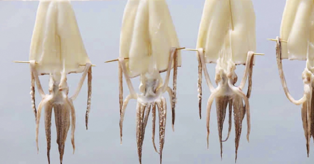 イカを開き、皮をとります。それを天日で約3〜4時間干します(干しすぎると固くなるので要注意)。干したイカに切れ目を入れ、網の上で焼きます。醤油、みりん、酒、砂糖の甘めのタレを2度付けして出来上がり。