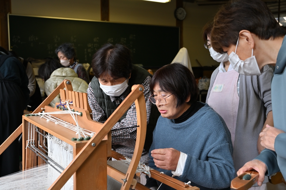 機織り機の使い方を学び、機織りの「トン」・「トン」という音が会場に響きました。