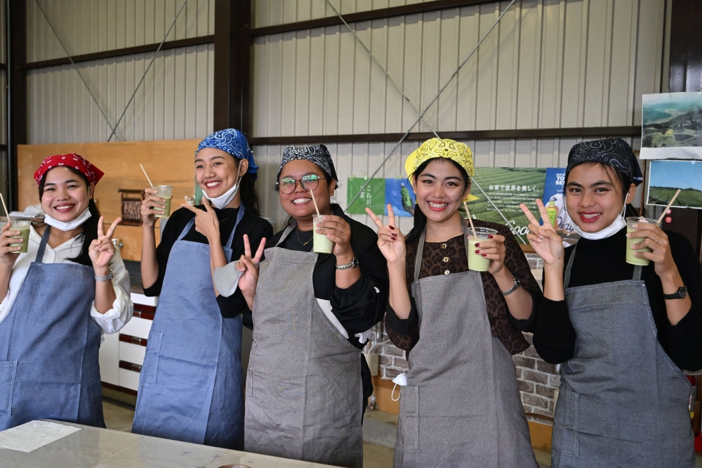 母国語で「乾杯!」して、煎茶ラテを味わいました。